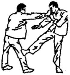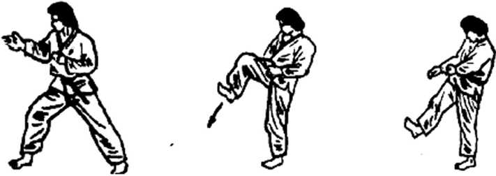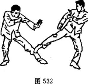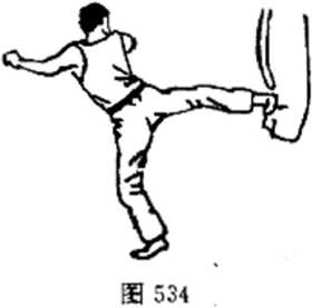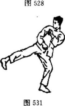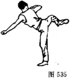 戒备式,攻击腿提起.脚尖扣向胫骨,斜朝上45度;用低 角度猛地向下踏去。如图536?538。