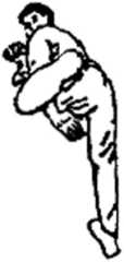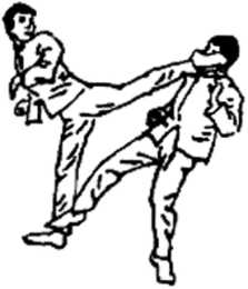 (5) 在面对一?个与你保持中等距离,小心谨慎的对手,如 图702,可用旋踢大胆地攻击其中部,如图703.如果遇到的是