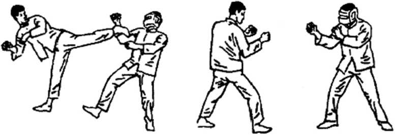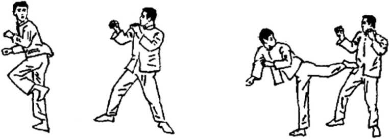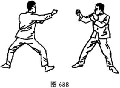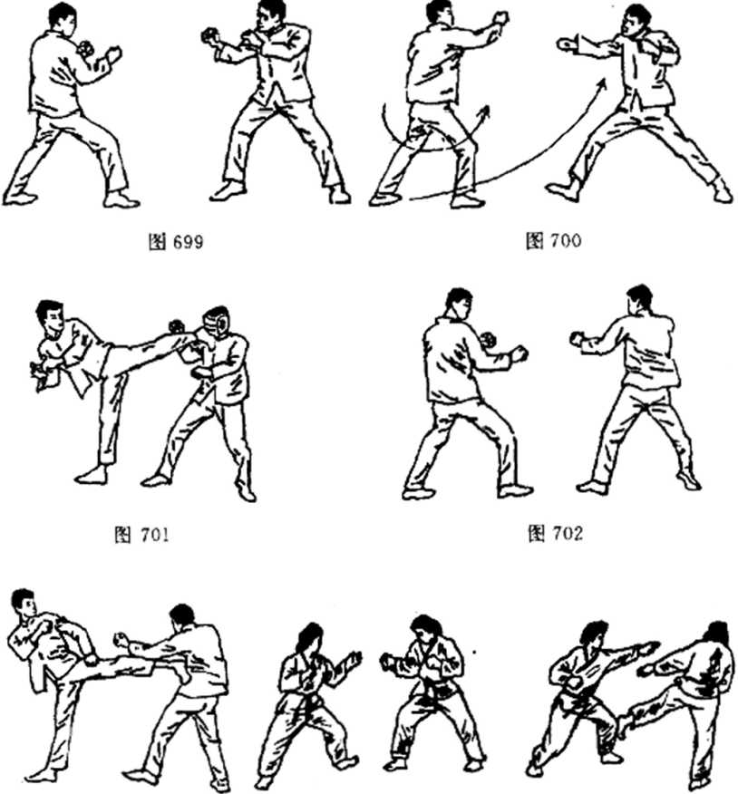 (4) 我与对手遥相对峙,如图699,都在相互试探,当我正 准备迎击进攻时.对手突然冲上来,如图700,我用一记旋踢准 确地踢在对手的脸上,如图701。