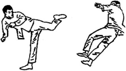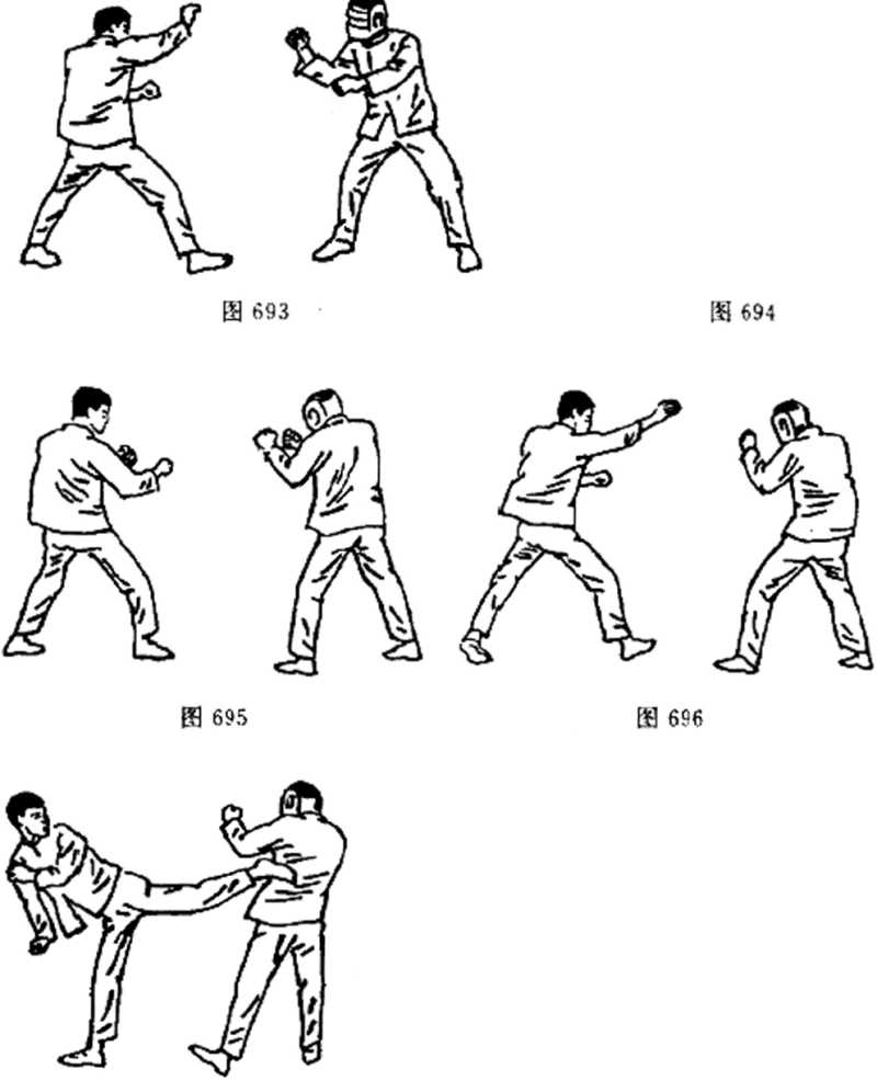 (3)对付站立姿势相反的对手,如图695,我先扬手,如图 696,接着便迅速转过身体,如图697,发出一脚旋踢,从其防 御的两手之间踢过,并将其踢倒,如图698。