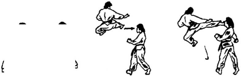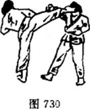先发后腿佯攻对手膝部。待对手的手臂下移拦截时,则立 即用高角度勾踢对手头部,如图731、732、7330