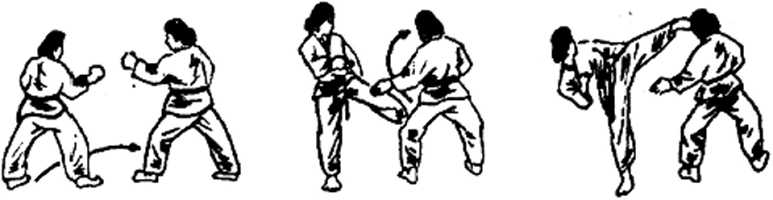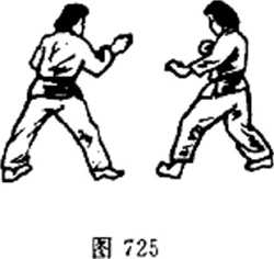 摆好戒备式,待对手猛扑过来;抓住空档,随即两腿同时 蹬地,起跳,腾空,飞腿直踹对手头、胸,如图725、726、72?。