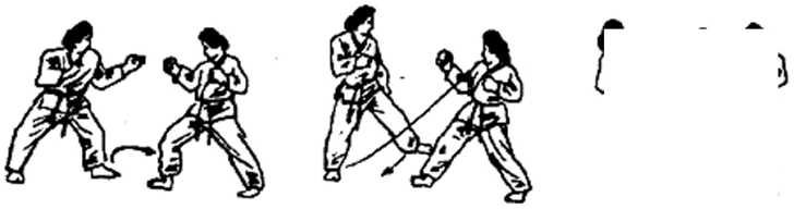 对方摆出右戒备式,我滑步上前以左脚勾踢对手的膝部。落 下后同时向左侧转身,以右腿高角度勾踢对手头部,如图728、 729、 730,