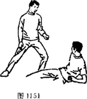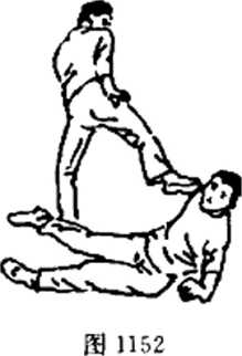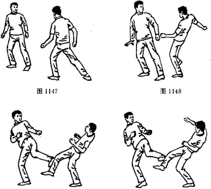 我上汽车时对手突然冲上来,以前踢击我胸腹,我后退一 步,待其脚一落地即侧踹其膝部,使其跪倒,然后上前勒住其 颈部。如图1153?1160。