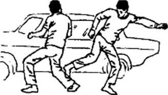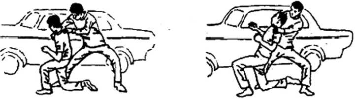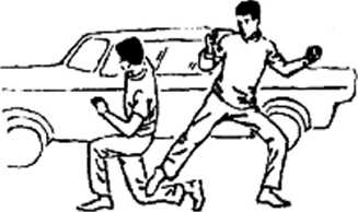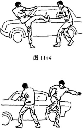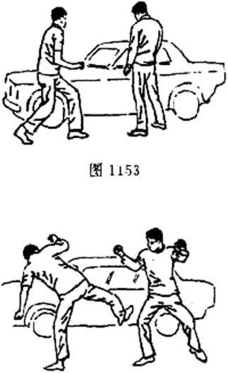 对手在我上汽车时突然拳近而发起攻击。我以侧踢击其前 腿膝部,将其踢倒,再用勾踢击其头部,如图1147?1152。