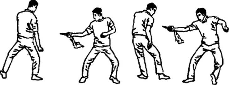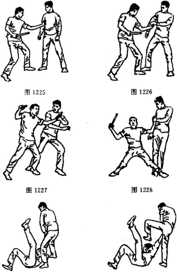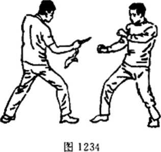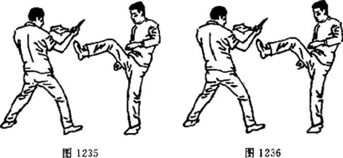 对手持短刀向我逼近欲刺,我对准其手腕猛踢一脚,将其 刺刀踢飞,如图1234?1236。