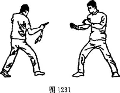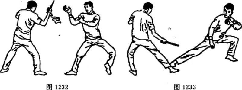 对手-双手握棍向我捕刺。我侧身闪避,同时抓住来棍,并 起前腿踢击其手皆,如图1222?1224。