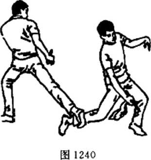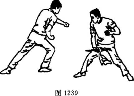对手持短刀向我冲来并横削我胸腹,我后闪躲过,看准其 空档迅速前移,侧踢其膝,将其踹倒,如图1237?1240。