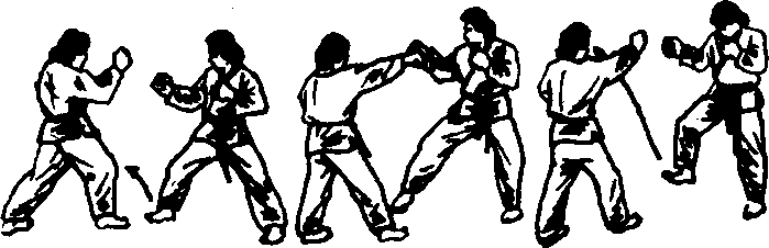 以脚后跟做小幅度旋转的闪避技法,往往是成功的。 做法为:从右脚在前的站立姿势开始,闪过向左肩打来的拳 202