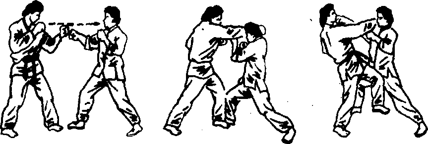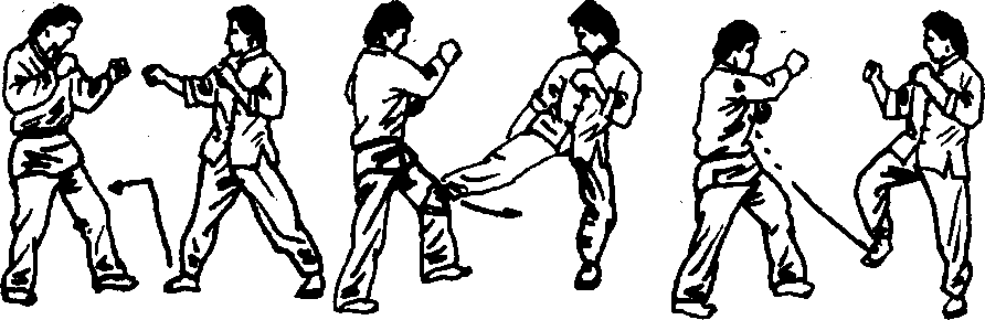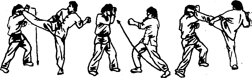 这三腿之中,第一腿是至关重要的,如打击得力,就能使 对手很快止步,为以后的攻击创造条件。在攻击时,攻击之腿 不落地的目的在于节省时间,增大攻击的突发性,使对手在还