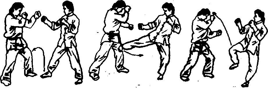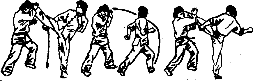由戒备式开始。如图598。先用前手虚晃一拳,紧接着迅 速抬起前脚侧踢对手的膝关节,如图599。然后在右脚略回收 后,如图600,再由屈到伸向上绕过对手的防御之手摆踢其头 部,如图601。在落下右脚的同时,如图602,向右前方转身,并 借助转体旋身的力量,左勾踢其头部或颈部,如图603。
