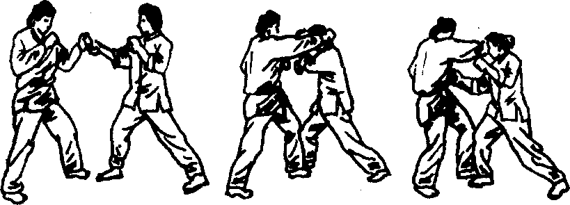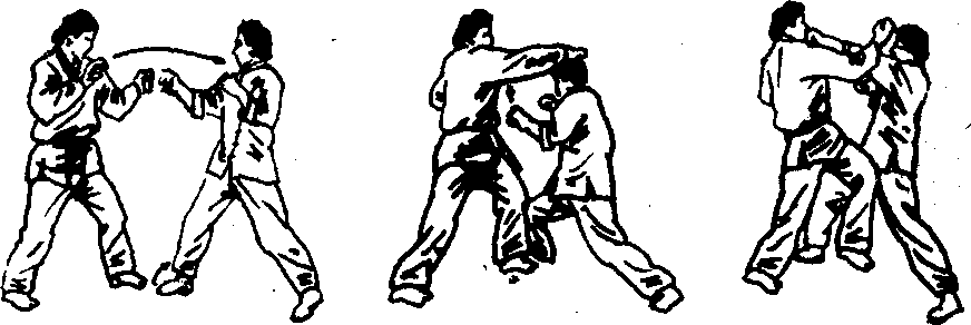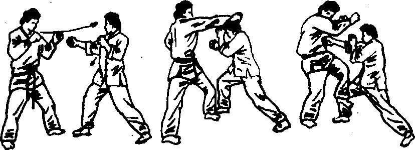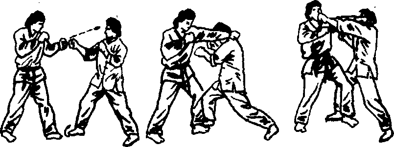 在运用躲闪战术时,通常伴随着踢击和拳击的反攻。要保 持视野开阔,因为任何攻击到来之时,是不会事先发出多少警 告的,并且要利用肘和前臂来进行防守。当对手发出猛烈攻击 时,运用躲闪战术可挫杀攻击者的锐气。并可使扭打混乱局面 转变为擒住对手的局面。当不用躲闪战术时,则要对直接向头 部打来的拳进行格挡。