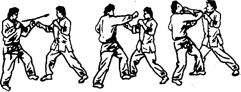 对动作迅疾或身高臂长的对手,在格挡时应向后退一步, 而且格挡动作要和手后退同时进行,不能先后退再格档,也不 能先格挡再后退。