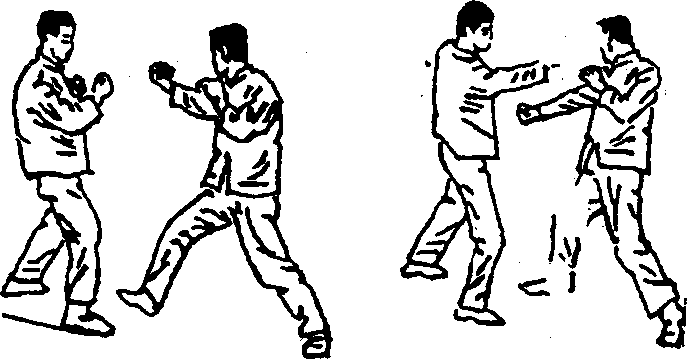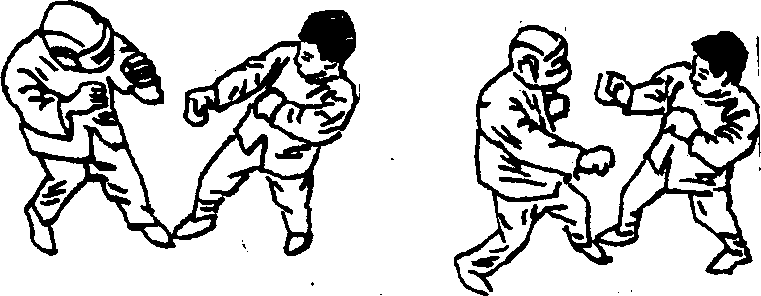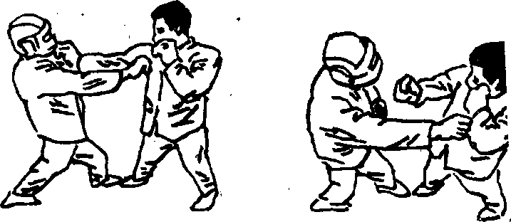 可用一根长棒来练习内侧高位格挡技术,见图641,642., 让同伴用棒直刺你的面部,你将身体重心移到前脚,且前腿膝 部微微弯曲以避开这一刺。同时用左手轻轻挡开棒子。