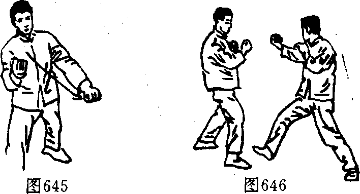 内侧低位格挡,是用来对付来自腰部以下的踢打:以右脚 在前的戒备式进行格挡为例,具体做法是顺时针方向向下做赠 半圆运动,如图643。同时随着膝盖的微屈将重心移至前腿。几 乎是同时,用左手反击,如图644。