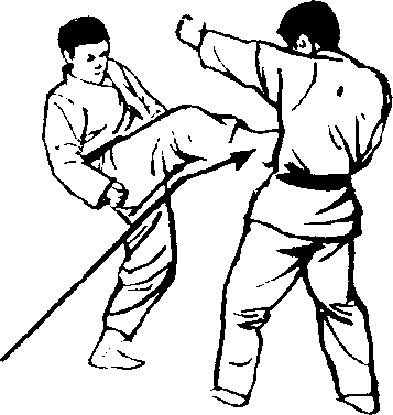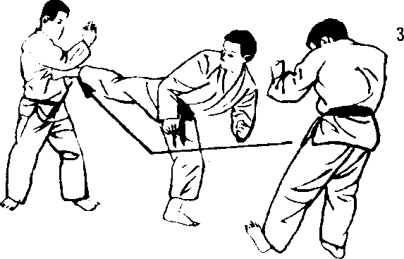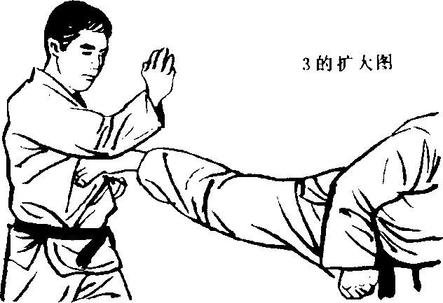3. 后方的对手,在2 的踢技刚使出之后,为 了攻击而前进,这时夹 在中间的人,以2时踢 出前踢技的同一脚,朝 后方使出脚刀后踢。
