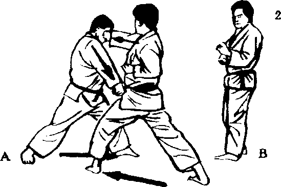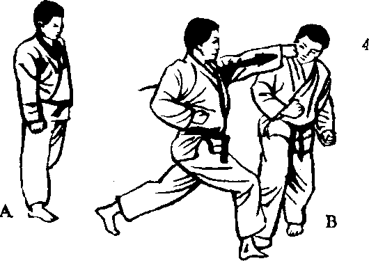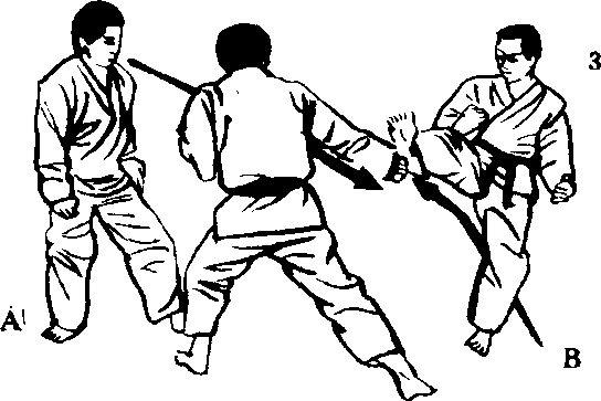 3. 当B从侧面以前踢 技踢入时,以2上段突 击的手扫落,同时把视 线朝向B。