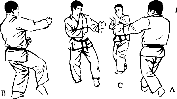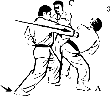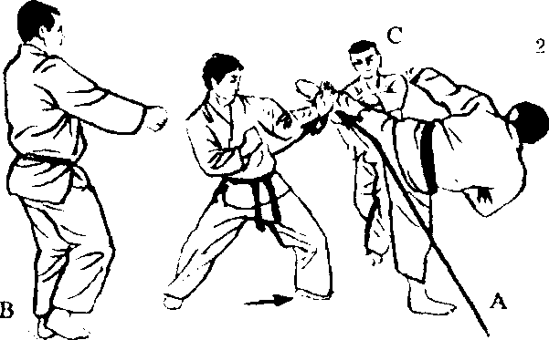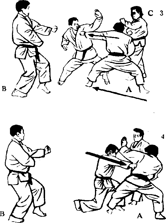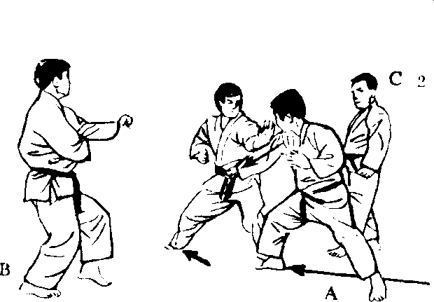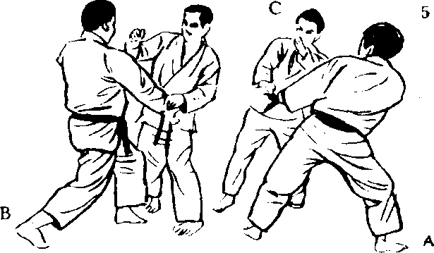 这个练习和3人交 手(1)不同,是完全受 住A,B,C的手部招 式后的反击,反复练习, 不仅能养成灵敏的反射 神经,又能锻炼体魄, 是应付实战最好的方法。 但是,和3人对打时, 难免会分散注意力,而 使姿势崩溃,所以,这 是上段者,尤其是以两 段以上的人为对象的练 习方法。