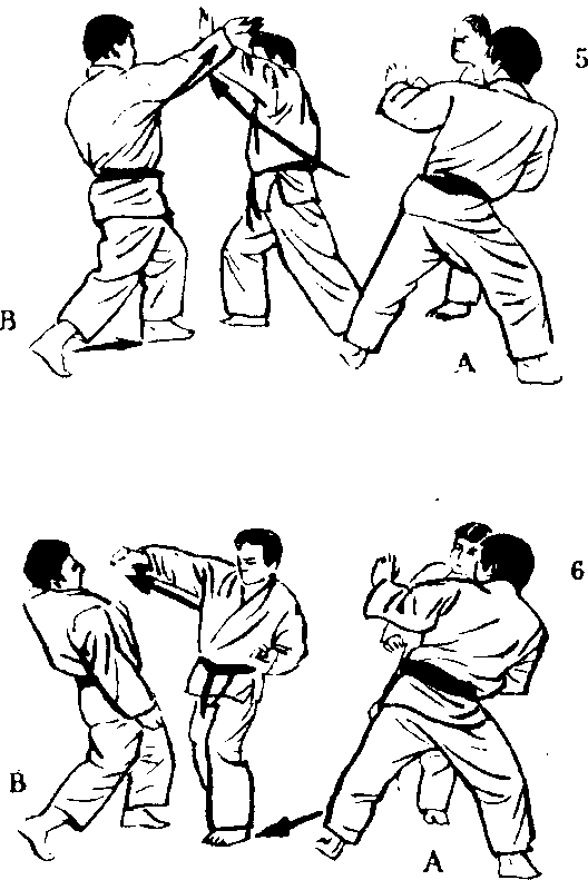 4. 对于发动手刀攻击 的B,保持原来的姿势, 挺起上半身以左手受招。 B或受手,内侧空虚的 话,就很容易造成破绽, 但是,B因为手刀的招 式而转移腰部,所以受