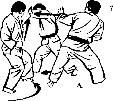 因此,要相反地以 6的右后脚为轴,朝正 后方移动左脚,而且, 象要缩短与C的间隔般 地,朝C的左手使出正 拳攻击,绕入时从侧面 以左手挂受,使对方中 段部位形成可乘之虚。