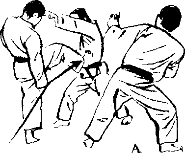 2. 对A从正面发动的 脚刀踢技,以前手使出 手刀受的招式,将对方 拨向一侧。在使出受技