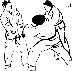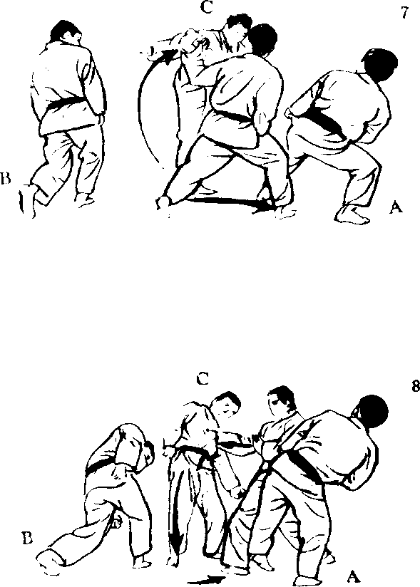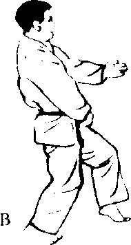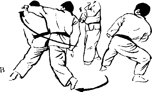 B的脸孔受到突击 而前进时,在右脚踏出 的同时,绕向右脚后方, 以背刀攻向颈动脉。