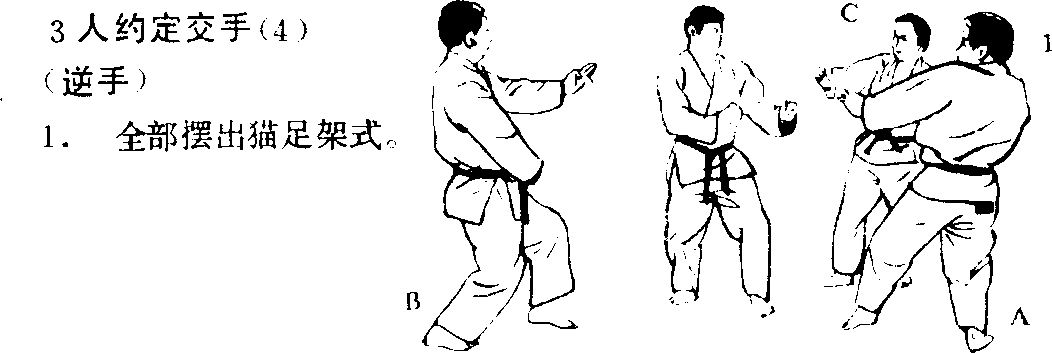 刚开始时,要决定 对手的顺序和使用的踢 技招式,然后慢慢地、 确实地受招,以反击招 式有效而顺利地取得由 A而B,由B而C的受 技时机和转身法。等习 惯后,不要限定外侧的 i^,此外,踢出的顺序 也不一定要从A到C, 可以自由地使出一招攻 击,培养灵敏的反射神 经,及使出连续招式的 能力。