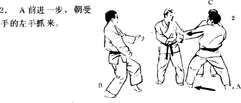 3. C受手要把被抓的手 的手心朝上,一面象把 A的手肘由下而上抬起 一般,一面以右手拇指按 住左手的小指根部,然 后把其余的四指放入A 的栂指内侧肌肉部位, 一面扭转手腕,一面取 得A的手腕的反手,使 A的姿势崩溃。