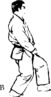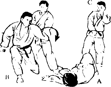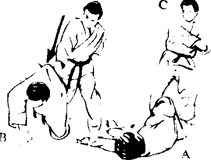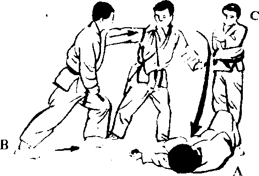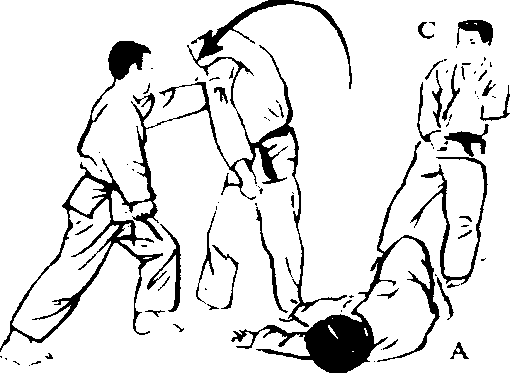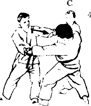 C朝后按倒一般地,朝 C的喉咙使出右手背刀 的招式。