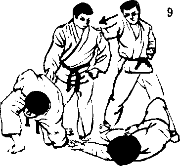 9. 受手以左手卷入对 方的右手,并以左手手 肘反向扭转对方的腰部, 使C的姿势后仰。