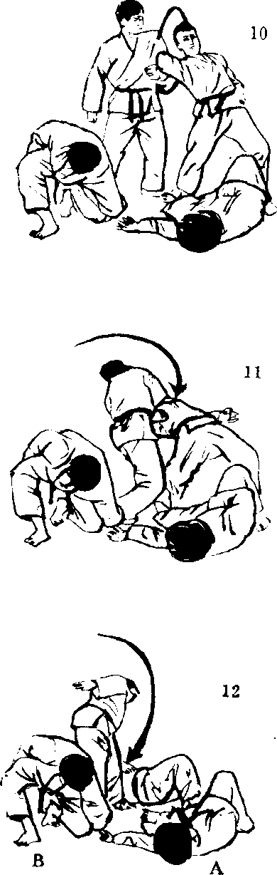6. 受手要以左手抓住 B的左手腕扭转,取得 逆手。如果左手的力量 不够,右手可以按住手 肘,绕过般地反手朝后, 把手腕弯向外侧后向按 倒对方。