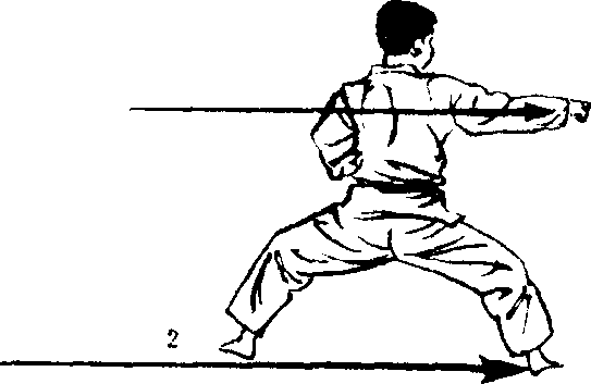 和三战立、前屈立 一样,把前脚移向横内 侧向后转,当前脚移向 一侧时,和前进相同,通 过四股立的中心点(重 心点)移动。移动宽度, 要从后脚跨出纵横两线,