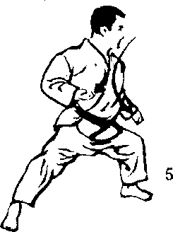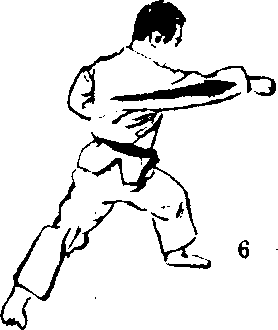 5. 接着,一面恢复左 手腕的弹性,在固定位 置使出中段扫的架式。 这种扫落,要大大地朝 内侧画弧,右手使出拉 手的架式。