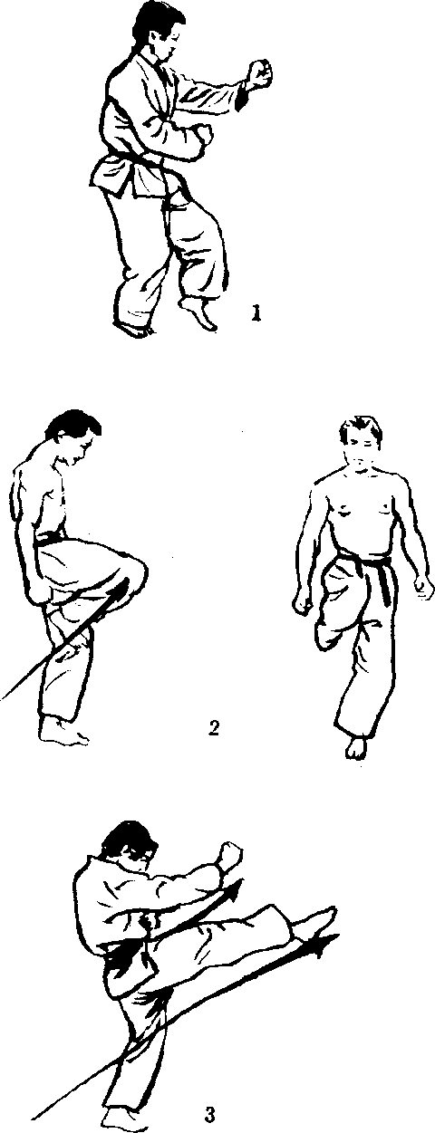 4. 踢技的拉脚要尽快 收回,但要踏前一步。踏 出时应该放下脚跟,使 脚心着地,像以后脚滑 出一般,在踏出前脚的 同时,垫起脚尖。