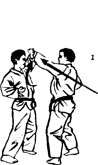 1. 把攻向外侧的左上 段正拳突,以三战立的 左上段接招。为了准备 下一次的攻击,右手收 回拉手二