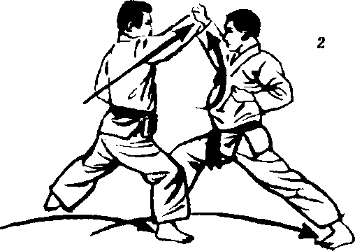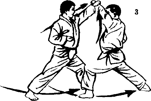 2. 从三战立接招的状 态,右脚向前踏出一*步, 以前屈立使出上段突的 招式。正拳目标对准对 方的人中或眉头。进攻 时要由下而上突出。采 取右脚在前的前屈立架 式。左手收回拉手。虽 然对方采取上段突击, 但我方不妨把左脚大大 地后退一步,摆出右脚 前屈立架式,右手使出 上段受。
