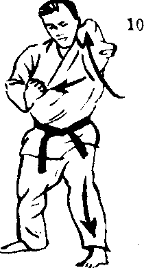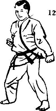 方向改为朝后的西 侧,一面把左脚向前踏 出,摆出右三战立的架 式,一面以3时的右拉 手,使出上段接的招式。