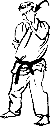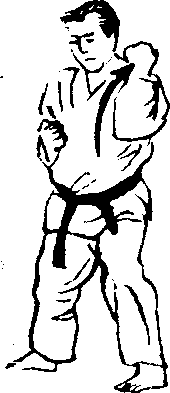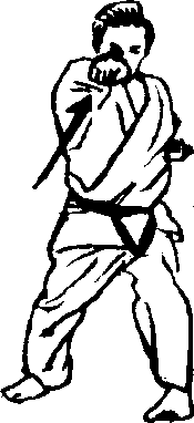 四股立的后脚(左 脚),朝南侧(正面)踏 出-步,’摆出左三战立 的架式,以左手使出向 正面的中段接。