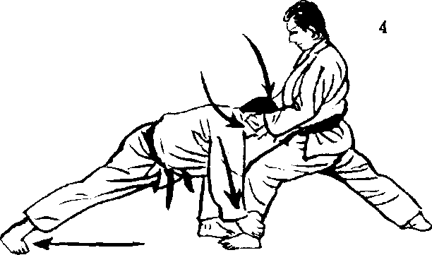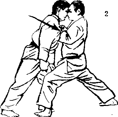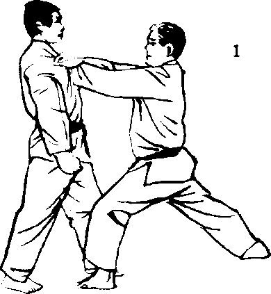 1. 演武者双手交叉抓 住对方的衣襟。摆出左 脚在前的前屈立架式。