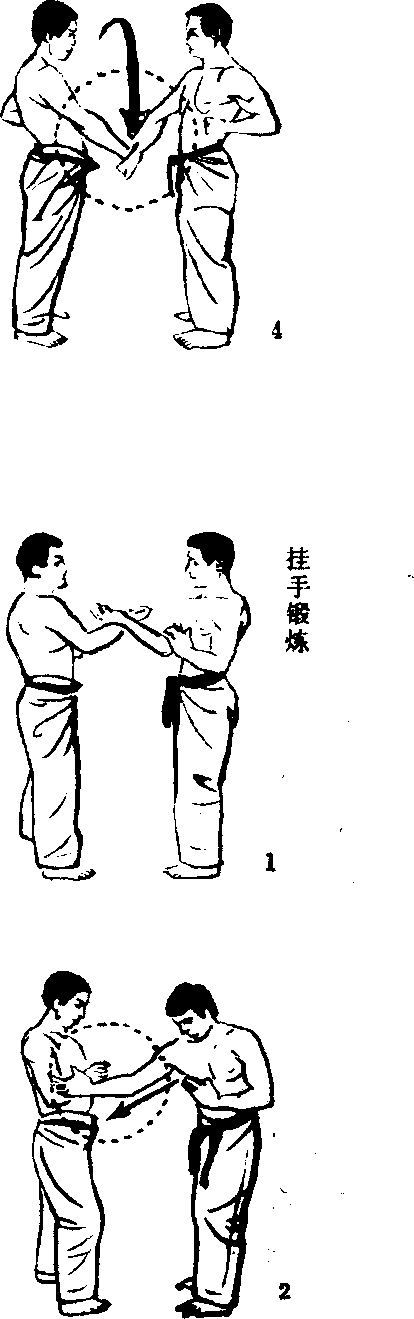 3. 这次由挂手的一方 在手臂翻转手心,绕进 般地朝身边挂拉过来。 被挂的一方一面把挂手 手心由下而上扭回,一 面让对方拉入。这时不 可松弛腋下的劲道。