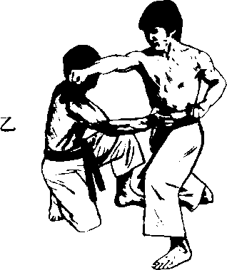 2. 甲攻右的瞬间,乙以 手掌敲推甲的下腹。甲 要想推回乙手掌,必须 向前强力挺腹推出而出