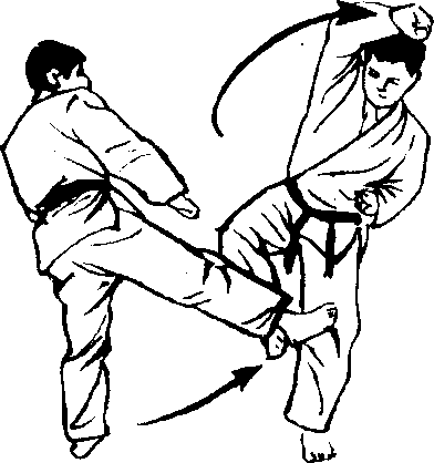 2. 从1的左脚前前屈 立架式,以后方的右脚 扫向对方的前脚,破坏 对方的姿势。同时,把 右手挥起,准备下一'次 的攻击。