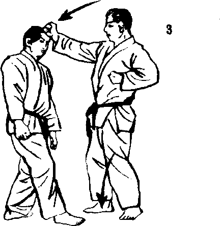 3. 扫脚后恢复姿势的 同时,把右脚踏前半步, 一面摆折足立架式,一 面利用2挥起的右手, 朝对方的头顶击下。从 2到3是连续招式,动 作要快。