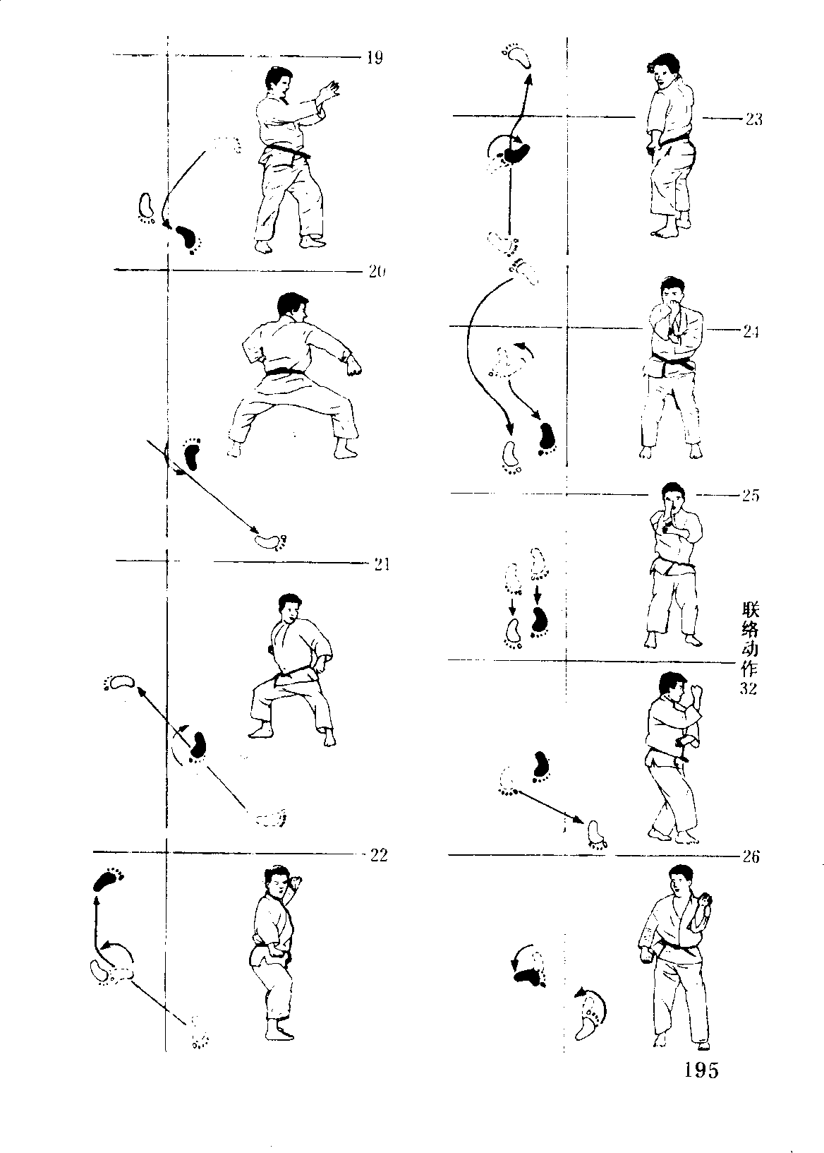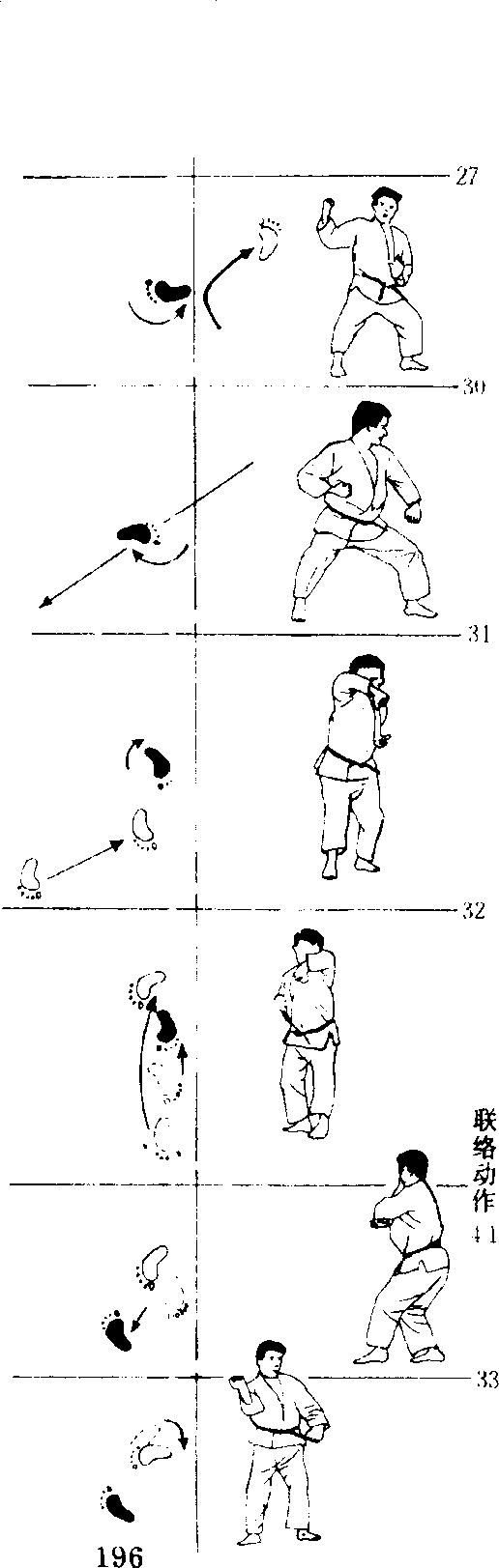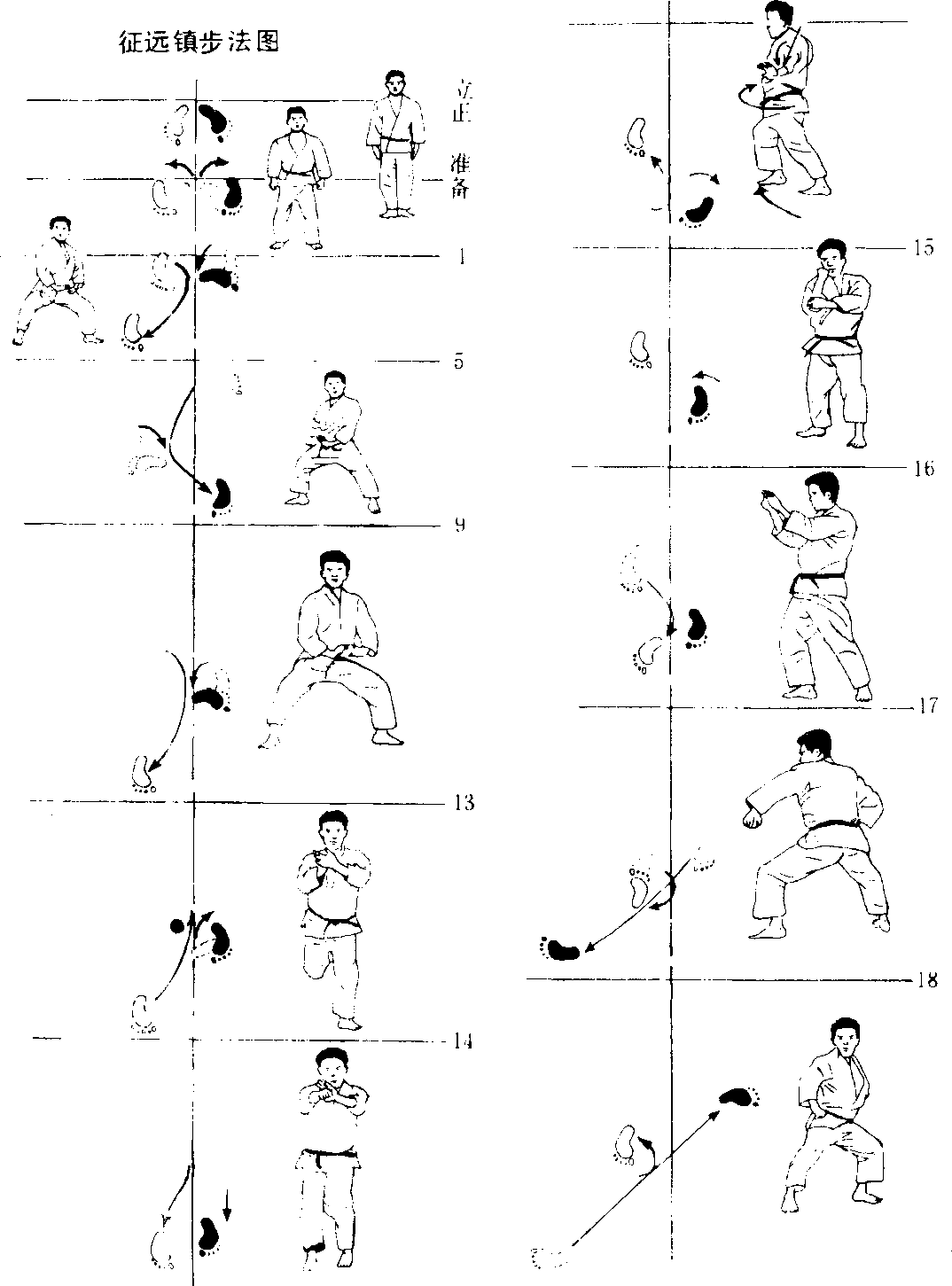 征远镇的演武线,如前所述,有米形的斜向交叉、四方斜 线等,这六个方向,说是四股立的转身,在演武上也不为过。 因此,征远镇演武的好坏,就被四股立的姿势所左右。