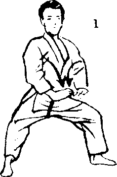 1. 右四股立四十五度, 征远镇的架式双手摆出 按住圆物般的架式。这 架式要以阴呼吸开始, 有垂落肩膀力量,以及 收聚两腋的目的。从联 络动作1开始吸气,然 后一面摆好1的架式, 一面呼气。