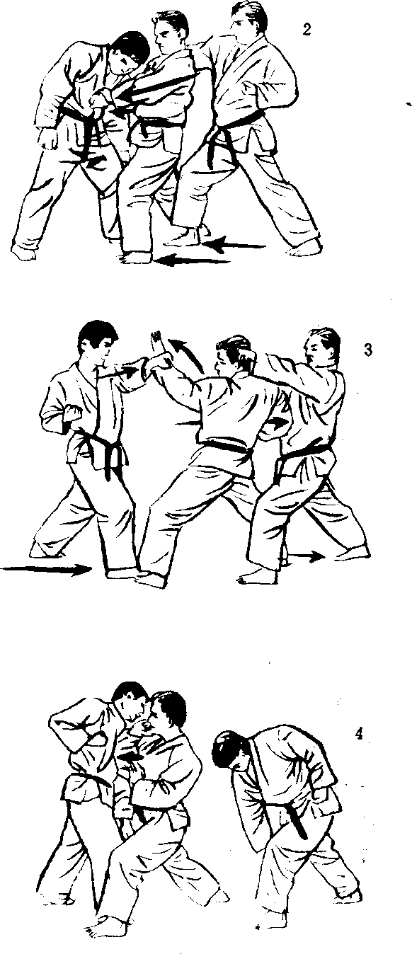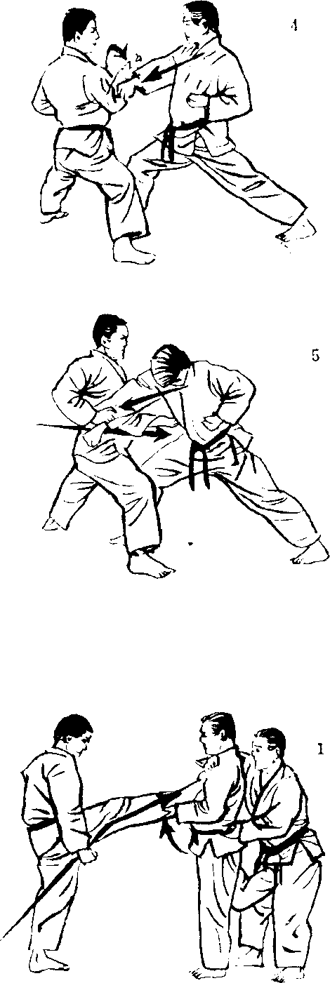 1. 对方从后方抱住我, 而另一个对手又从前面 使出前踢技时,这时应 该收回四股立的右脚, 姿势抬高,以右脚跟踢