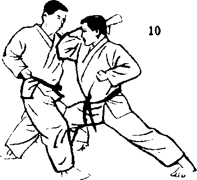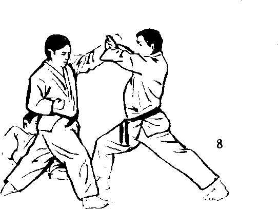 10?踢出的左脚故下的 同时,右脚踏出,摆出 前屈立的架式,朝对方 中段使出右手肘撞技。