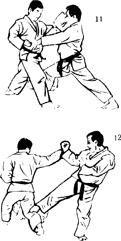 il 继续以左拉手朝对 方的心窝,使出中段正 拳突。 12 在对手反击的同时, 收回右脚躲开对方的突 技,並抬起右脚,对方 的姿势朝侧面时,朝对 方前脚右关节部位的侧 面,使出关节踢功(参 照三十六戶的16?19)。
