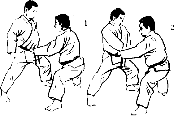 1. 如果对方以双手抓 住衣#或衣襟较低的部 位,就要和对方並立, 摆出四股立的姿势。