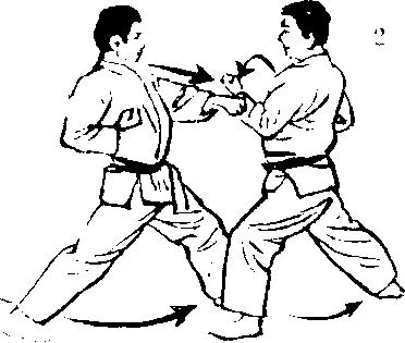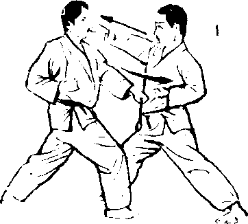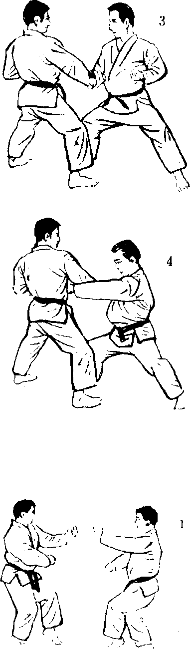1. 双方敬礼结束之后, 都摆出左三战立的〔突 技〕架式(和一本组手 的2的姿势相同)。